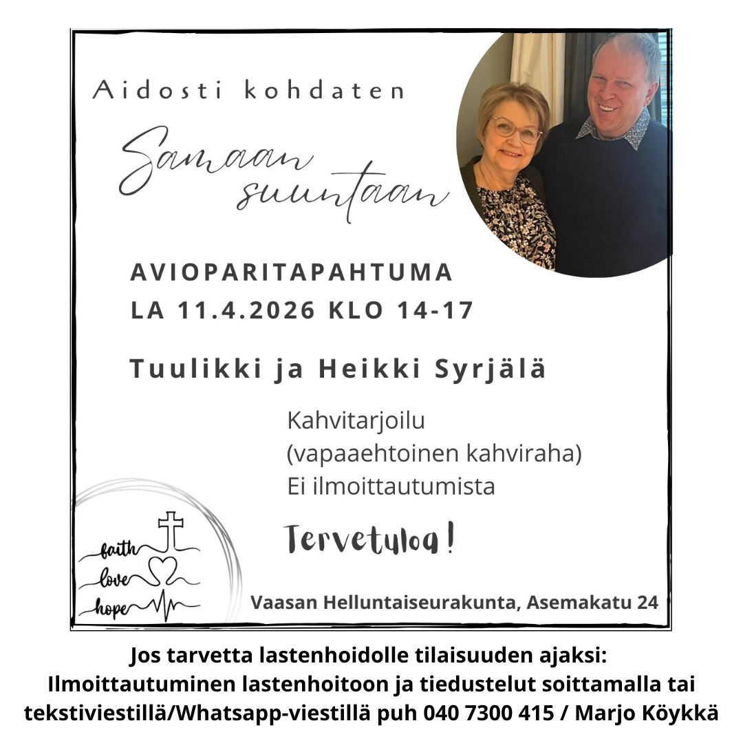 Seurakunta koostuu kaikenikäisistä ja monenlaisista ihmisistä. Haluamme nähdä, että seurakunta on koti, jossa jokainen saa tuntea kuuluvansa perheeseen ja olevansa rakastettu. Turvaudumme Jeesuksen ristintyöhön puolestamme.