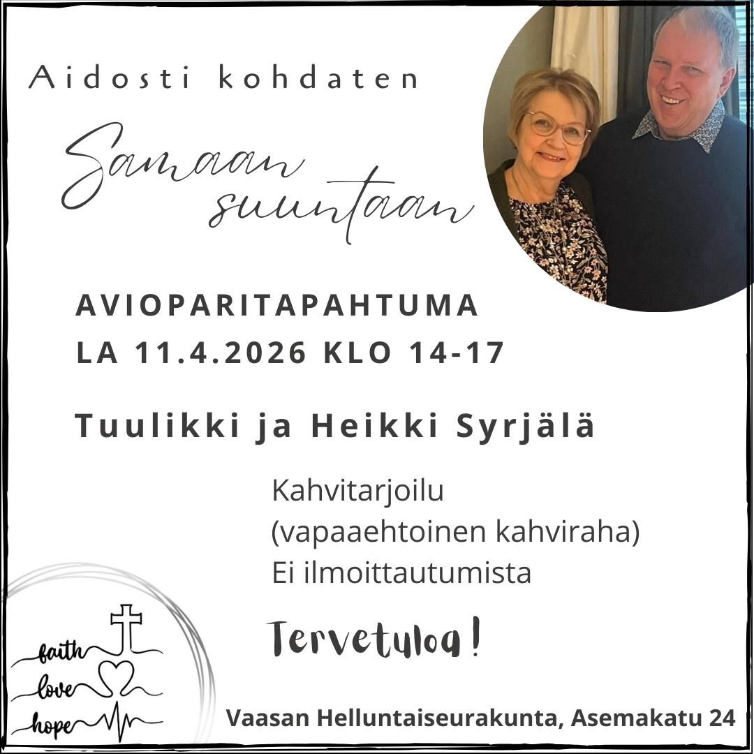 Samaan suuntaan -avioparitapahtumaan la 11.4.2026 klo 14-17 saamme puhujavieraiksi Tuulikki ja Heikki Syrjälän Vaasasta. Tuulikki ja Heikki ovat tehneet pitkään avioparityötä ja luennoineet useissa parisuhdetapahtumissa. Päivän teemana on ´Aidosti kohdaten´.
