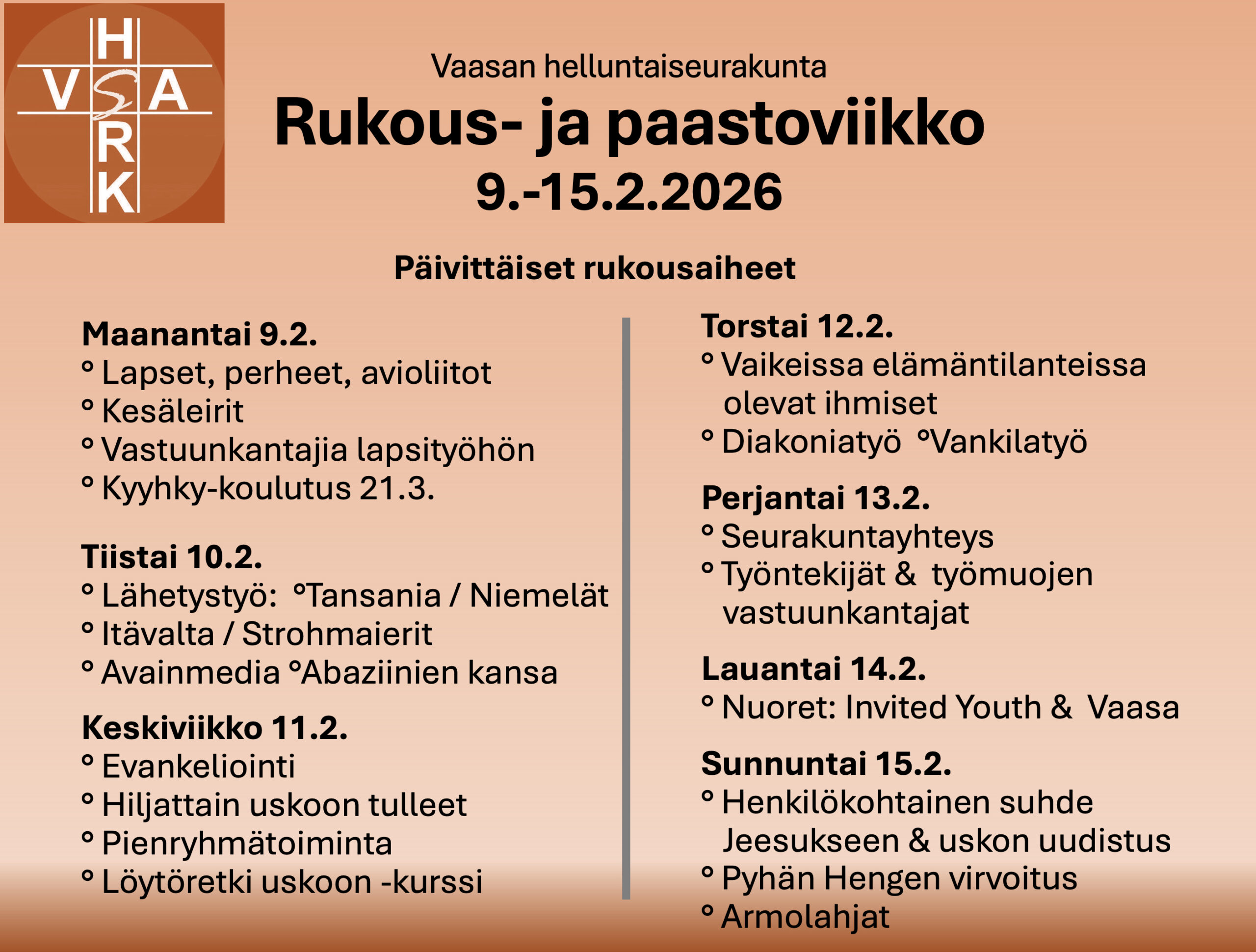 RUKOUS- JA PAASTOVIIKKO 9.-15.2. katso päiväkohtaiset rukousaiheet